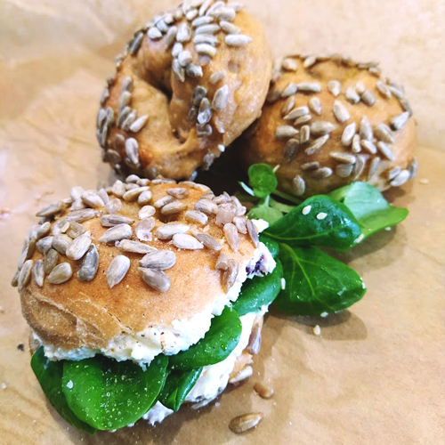 V míse promícháme oba druhy mouky s práškem do pečiva a solí. Přidáme jogurt a vymícháme těsto. Těsto by se nemělo lepit. Těsto si na válu rozdělíme na šest kousků a ukoulíme bulky. Nicméně z těsta se dají uplést i housky, rohlíky, popř. v bulkách udělat dírky a vytvořit tak bagely. Pečivo pomašlujeme rozšlehaným vejcem a obalíme v semínkách dle vlastní volby.