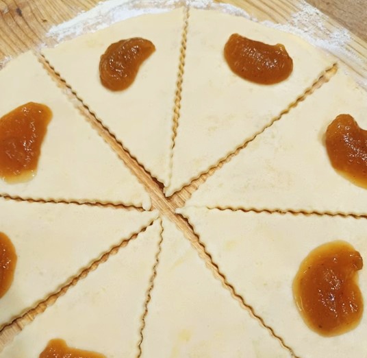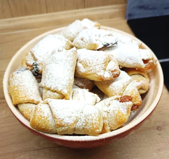 Z uvedených surovin vypracujeme rychle těsto, zabalíme ho do folie a necháme vychladit v lednici. Těsto tam můžeme uložit i přes noc. Po vyndání si těsto rozdělíme na čtyři kusy. Z každého kusu vyrobíme kouli, kterou rozválíme do kruhu. Ten pak rozdělíme na 8 trojúhelníků. Do spodní části dáme náplň dle své volby a poté zamotáme na rohlíček. Rohlíčky potřeme rozšlehaným vejcem a necháme péct v troubě na horkovzduch na 180 °C, cca 20 minut – dozlatova.
