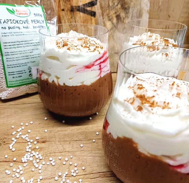 Pro mnohé může být tapioka ještě velkou neznámou. Já jsem si ji po vyzkoušení ale velice oblíbila a když jsem zjistila, kolik stojí hotový pudink v krámě, začala jsem zjišťovat, jak si ji nachystat doma. Domácí vyjde mnohonásobně levněji a můžete si ji dochutit čím chcete. Moje oblíbená je s magem, nebo čokoládová verze s kyselejším ovocem. Jelikož je tapioka pouze škrob a tak Vás nezasytí na delší čas, ráda k ní přidávám tvaroh ochucený pouze kapkou medu. Z tohoto množství jsem nachystala 5 skleniček.