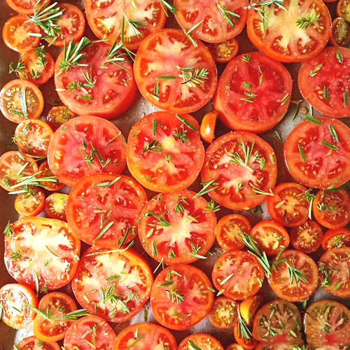 Rajčata nakrájíme na menší části a narovnáme na plech vyložený pečícím papírem. Osolíme, pocukrujeme, pokapeme octem, posypeme česnekem a snažíme se rovnoměrně rozložit bylinky, nakonec zakápneme olejem. Pečeme pozvolna v troubě na cca 150°C cca 1,5 – 2 hodiny. Délka pečení je závislá na tom, kolik rajčata obsahují vody. Dáváme pozor, aby nezačala černat.