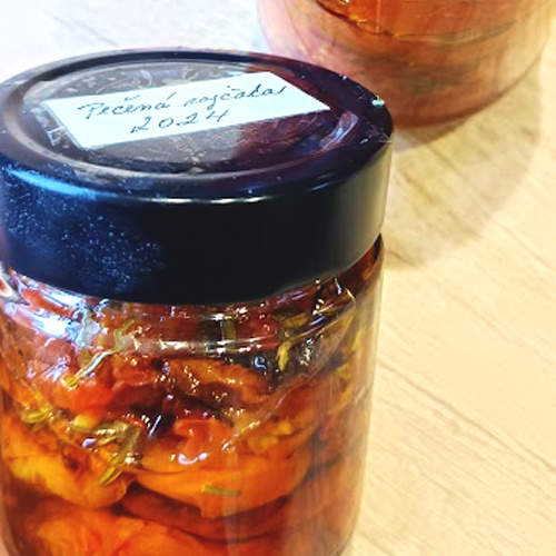 Po upečení ještě horké narovnáme do vysterilizovaných skleniček. Rajčata rovnáme zhruba do ¾ výšky sklenice a zalijeme olivovým olejem. Je nutné, aby rajčata byla celá zalitá (rajčata postupně nasakují olej, takže kdyby byla sklenice plná, je možné, že by olej začal vytékat).